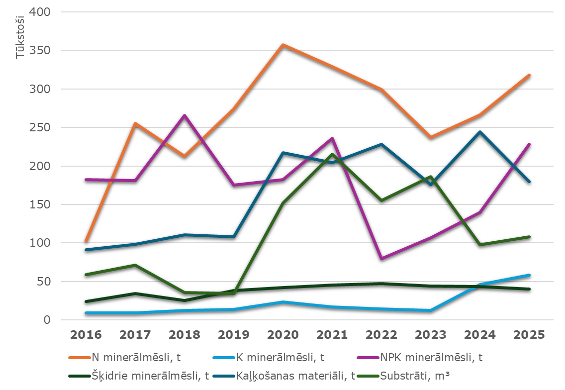 Pēc būtiska krituma, ko 2022. gadā izraisīja Krievijas agresija Ukrainā, 2025. gadā Latvijā ievestais un saražotais mēslošanas līdzekļu apjoms pieaudzis un pietuvojies 2020. un 2021. gada līmenim.