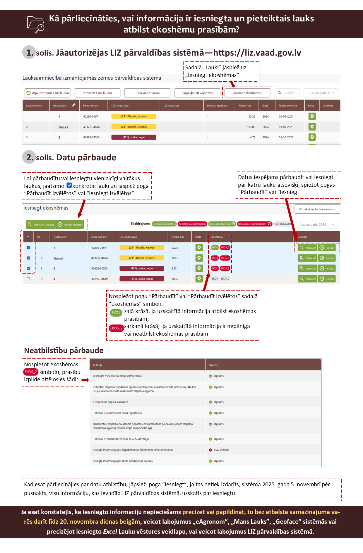 - Informācijas uzskaiti var veikt arī VAAD LIZ pārvaldības sistēmā. Pēc ģeotelpiskā iesnieguma iesniegšanas LAD 2025. gada sezonas lauki tiek importēti arī LIZ pārvaldības sistēmā, un lauksaimnieki var ievadīt informāciju, kas nepieciešama ekoshēmu atbalsta nosacījumu izpildei.