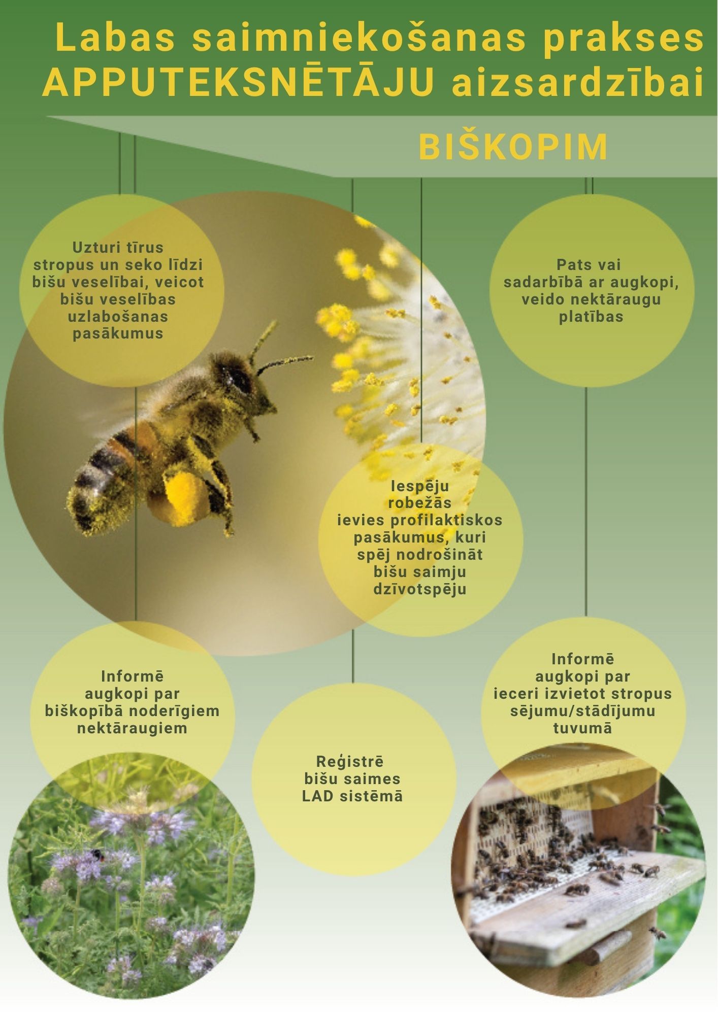 Bites ir būtiski lauksaimnieku palīgi – kultūraugu apputeksnētāji, tāpēc ar to klātbūtni jārēķinās vienmēr, bet it īpaši gadījumos, ja sējumos vai stādījumos tiek lietoti insekticīdi, kā arī, ja blakus saimniecībās ir bišu dravas. Ja uz augu aizsardzības līdzekļa (AAL) aizsargiepakojuma un iepakojuma marķējuma ir drošības frāze “SPe8 Bīstams bitēm. Lai aizsargātu bites un citus apputeksnētājus, lietot pēc 22.00 un pirms 5.00. vietās, kur: ir ziedoši kultūraugi un/vai ziedošas nezāles; vietās, kur bites aktīvi meklē barību”, tas nozīmē, ka šos AAL minētajās situācijās var lietot tikai nakts laikā. Skaidrojums - “Vietas, kur bites aktīvi meklē barību” ietver arī gadījumus, kad ir novērojama jebkāda aktīva bišu darbība apstrādājamā platībā, piemēram, kad novērojama bišu pārlidošana uz blakus esošu teritoriju barības ievākšanai.