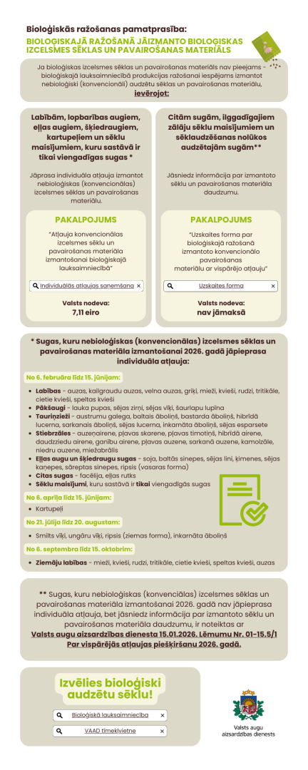 2026. gadā konvencionālas (nebioloģiskas) izcelsmes sēklas un sēklu maisījumu, kas sastāv tikai no viengadīgajām sugām, izmantošanai bioloģiskajā ražošanā individuāla atļauja jāpieprasa noteiktos laikposmos:
